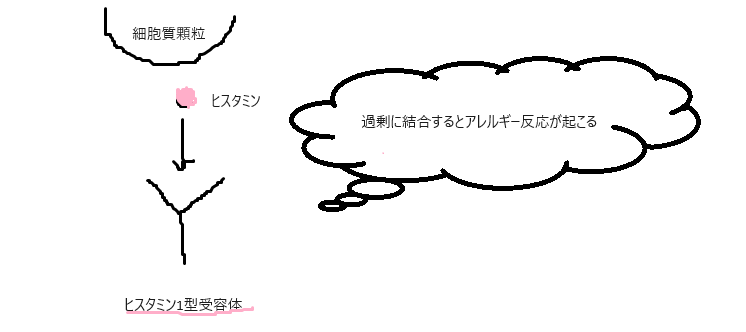 <blockquote>血圧降下、血管透過性亢進、平滑筋収縮、血管拡張、腺分泌促進などの薬理作用があり、アレルギー反応や炎症の発現に介在物質として働く。ヒスタミンが過剰に分泌されると、ヒスタミン1型受容体(H1受容体)というタンパク質と結合して、蕁麻疹やアレルギー性疾患の原因となる。</blockquote>